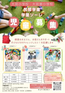 2024年9月28日 / 最終更新日時 : 2024年9月28日 lavoro-imai お知らせ 2025年春ご入学児童保護者のみなさま 学童ソーレでは新年度ご入学される児童の募集をしております。 ご質問・見学随時承ります‼